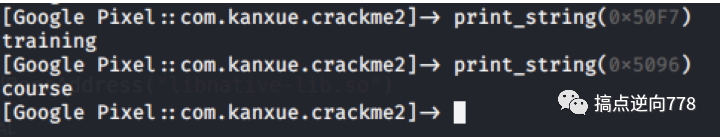 是 abcdefgh 这 8 个, 所以是加到 kanxue 后面的, 然后真正的字符串之前我们已经解密了, 是 unk_50F7(即为 training), 然后后面猜也猜得到剩下 6 个字符是之前解密的 unk_5096(即为 course) 为了保证严谨性, 我就在 inlinehook 一次