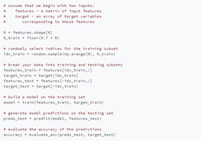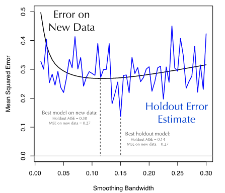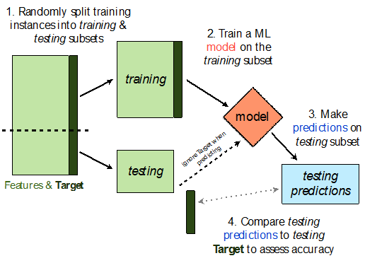 同一份训练数据既用于数据拟合又用于准确率评估,会导致过度乐观。最容易的规避方法是分别准备训练和测试的两个子数据集,训练子集仅用于拟合模型,测试子集仅用于评估模型的准确率。这个方法被称作是 holdout 方法,因为随机地选择一部分训练数据仅用于训练过程。通常保留 30% 的数据作为测试数据。