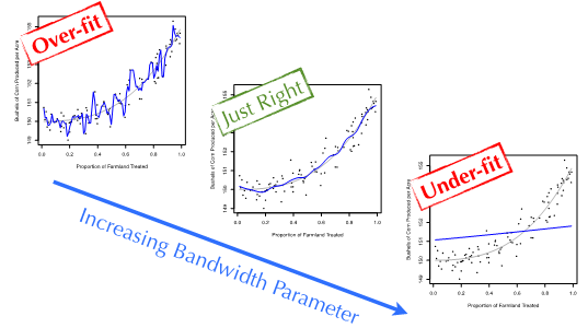 监督学习的主要任务就是用模型实现精准的预测。我们希望自己的机器学习模型在新数据(未被标注过的)上取得尽可能高的准确率。换句话说,也就是我们希望用 训练数据训练得到的模型能适用于待测试的新数据。正是这样,当实际开发中训练得到一个新模型时,我们才有把握用它预测出高质量的结果。现在,假设我们要使用一个简单的非参数回归模型来构建耕地农药使用率和谷物亩产量的模型。最简单的机器学习回归模型之一就是内核平滑技术。内核平滑即计算 局部平均:对于每一个新的数据来说,用与其特征值接近的训练数据点求平均值来对其目标变量建模。唯一一个参数:宽参数,是用来控制局部平均的窗口大小。内核平滑窗宽参数取值不同所产生的效果。窗宽值较大时,几乎是用所有训练数据的平均值来预测测试集里每个数据点的目标值。这导致模型很平坦,对训练数据分布的明显趋势欠拟合(under-fit )了。同样,窗宽值过小时,每次预测只用到了待测数据点周围一两个训练数据。因此,模型把训练数据点的起伏波动完完全全地反映出来。这种疑似拟合噪音数据而非真实信号的现象被称为过拟合(over-fitting )。我们的理想情况是处于一个平衡状态:既不欠拟合,也不过拟合。