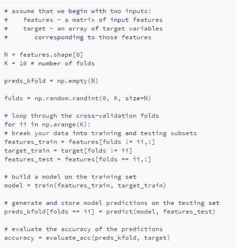 模型评估中一个难解之处在于模型在训练集数据上的误差不能反映其在新数据集上的误差情况。为了更好地估计模型在新数据集上的错误率,我们必须使用更复杂的方法,称作交叉验证(cross validation ),它严格地使用训练集数据来评价模型在新数据集上的准确率。